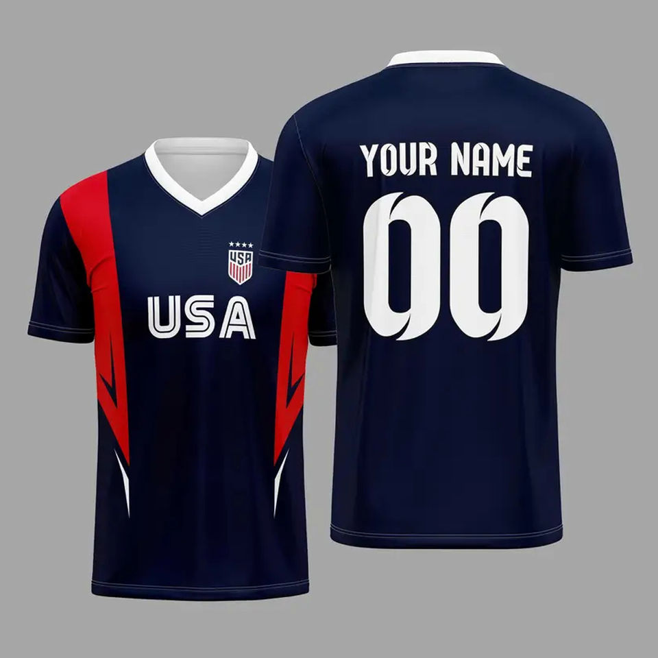 ออกแบบเสื้อแข่งของคุณเอง เสื้อฟุตบอลคอวีสำหรับทีมกีฬาชาย พิมพ์ชื่อและหมายเลขด้านหน้าและด้านหลัง