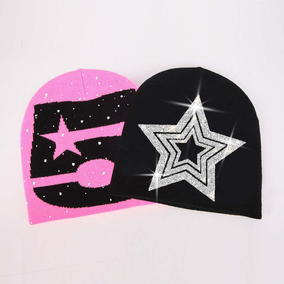 ผลิตหมวกบีนนี่ Y2K แบบ Jacquard พร้อมโลโก้ของคุณเอง พิมพ์ลายทั่วทั้งใบ ตกแต่งด้วยคริสตัลตามสั่ง