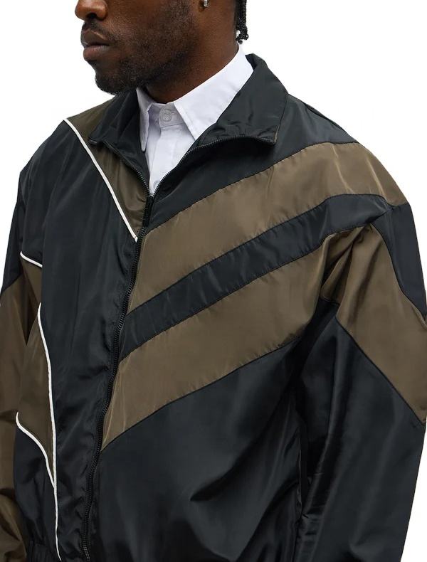 เสื้อแจ็คเก็ตแทร็คไนลอนแบบมีซิปปักโลโก้สไตล์เรโทร พร้อมแถบตกแต่ง เสื้อแจ็คเก็ตกันลมสำหรับผู้ชาย