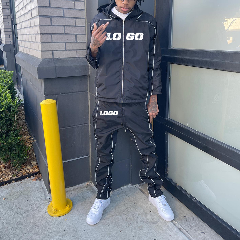 ชุดเซ็ต 2 ชิ้นสำหรับผู้ชายแบบมีซิป ชุดวอร์ม กางเกงไนลอนและเสื้อฮู้ด ชุดสเวตสูททรงหลวม ชุดวอร์มกันลมแบบกำหนดเองสำหรับผู้ชาย