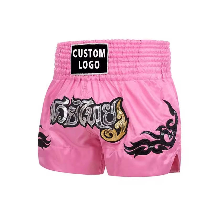 กางเกงขาสั้นผ้าซาตินแบบปักสำหรับผู้ชายเข็มขัดคุณภาพสูงและโลโก้ได้ตามต้องการสำหรับฝึกซ้อมคิกบ็อกซิ่งและศิลปะการต่อสู้