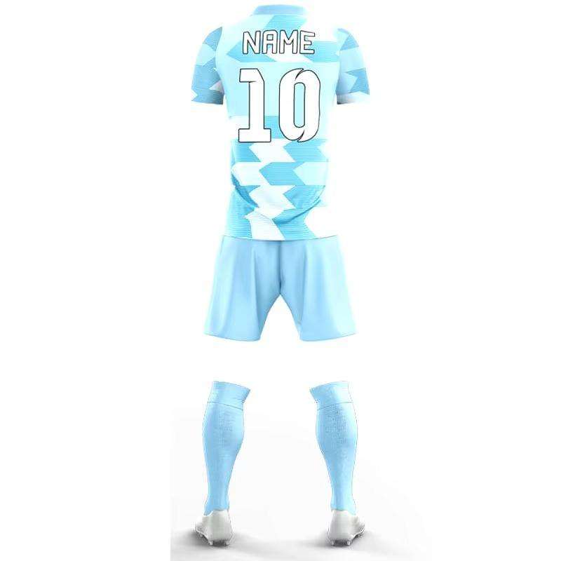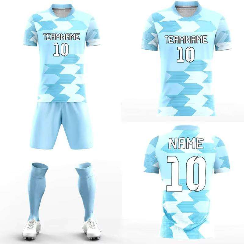 ชุดฟุตบอลสำหรับผู้ชายชุดฝึกซ้อมเสื้อเจอร์ซี่สีฟ้าแห้งเร็วระบายอากาศได้ดีชุดฝึกลายเรขาคณิต