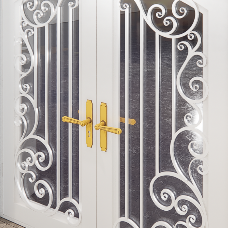 ประตูหน้าเหล็กปลอมแปลงแบบกำหนดเองได้รับการออกแบบให้มีส่วนแทรกแก้วและแผงตกแต่งสำหรับบ้านสุดหรูและทางเข้าวิลล่า