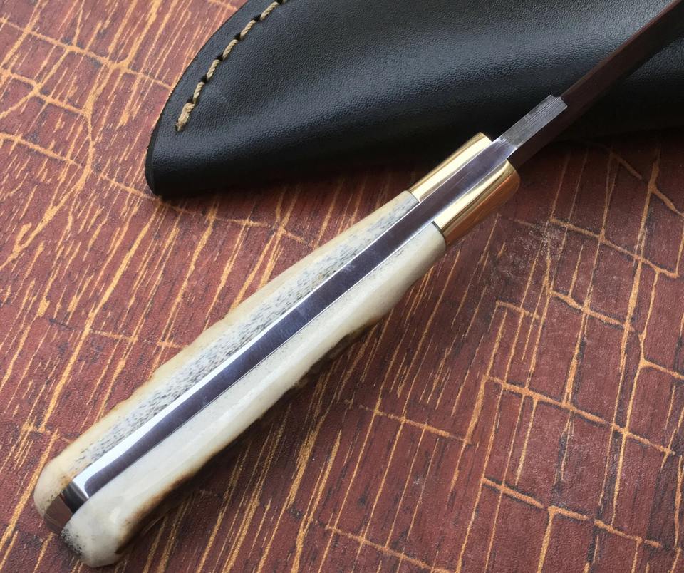 มีดสกินเนอร์ด้ามจับปลอกหนังทำด้วยมือทำจากเหล็กดามัสกัส