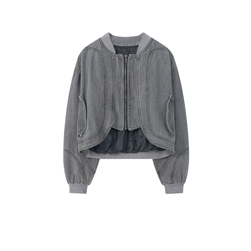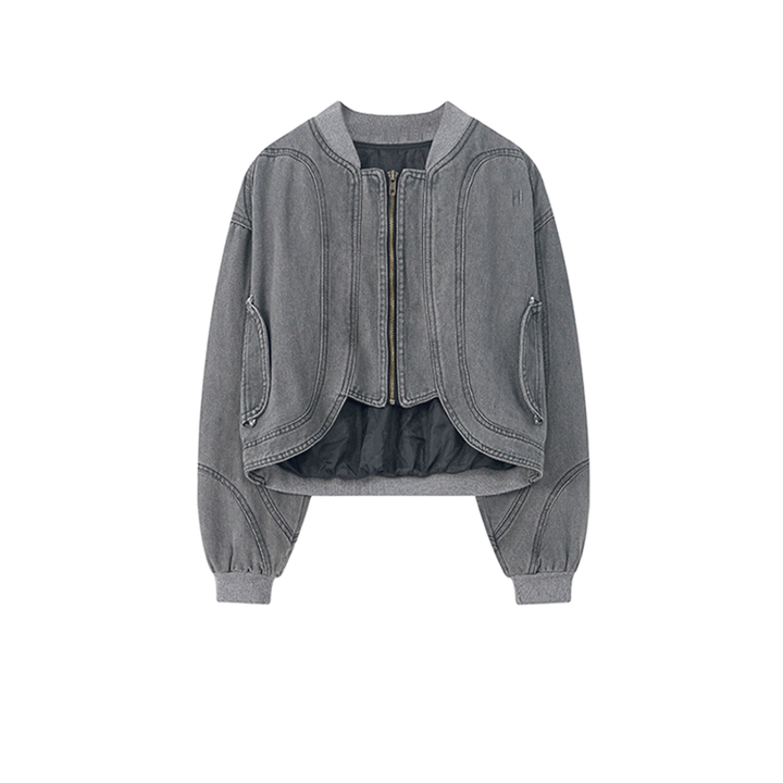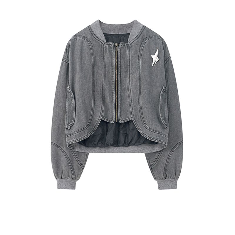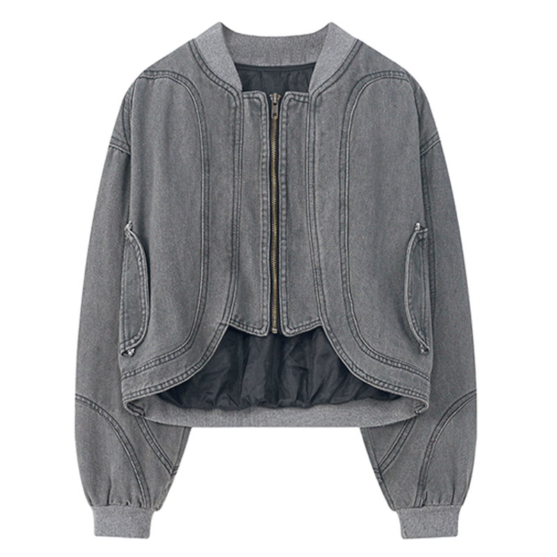 แจ็กเก็ตยีนส์ฟอกสีซิปมีฮู้ดเสื้อครอปแจ็คเก็ตผ้าฝ้าย100% วินเทจผ้าดิบปรับแต่งได้
