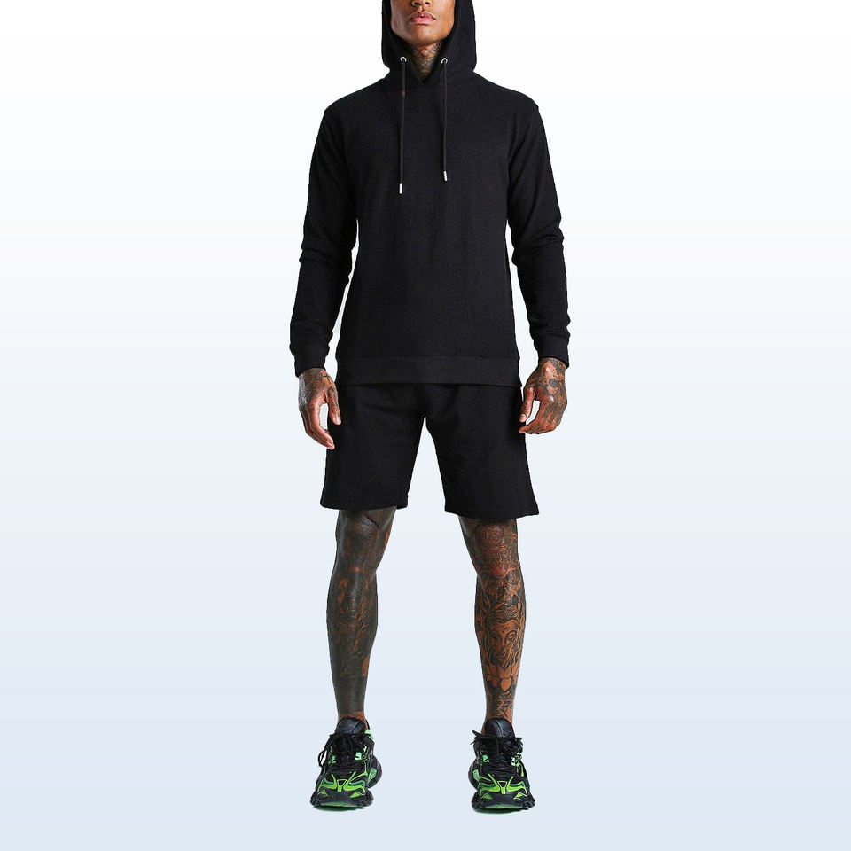 ชุดเซ็ต 2 ชิ้น เสื้อฮู้ดดี้และกางเกงขาสั้นผ้าฝ้าย 100% สำหรับผู้ชาย พร้อมโลโก้แบบกำหนดเอง กางเกงขาสั้นแบบย้อมสี และเสื้อฮู้ดดี้แบบสวมหัวสำหรับผู้ชาย
