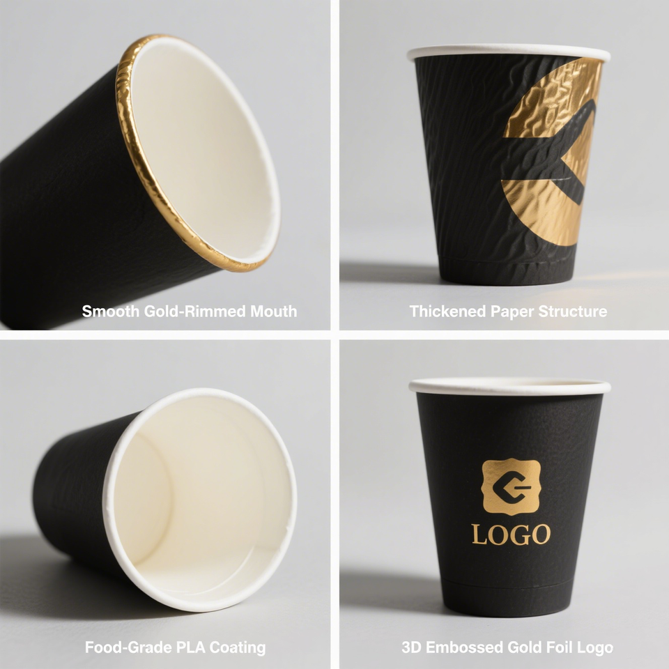 ถ้วยกระดาษฟอยล์สีทองแบบใช้แล้วทิ้งพร้อมฝา PS ขนาด4ออนซ์8ออนซ์12ออนซ์โลโก้ที่กำหนดเอง