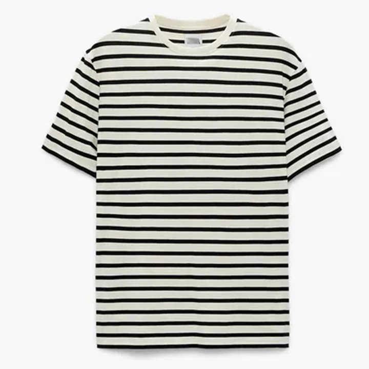 เสื้อยืดผู้ชาย แขนสั้น คอกลม ลายทาง ผ้าคอตตอนถัก 100% คุณภาพสูง ระบายอากาศได้ดี ทรงหลวม น้ำหนักมาก สไตล์หรูหรา