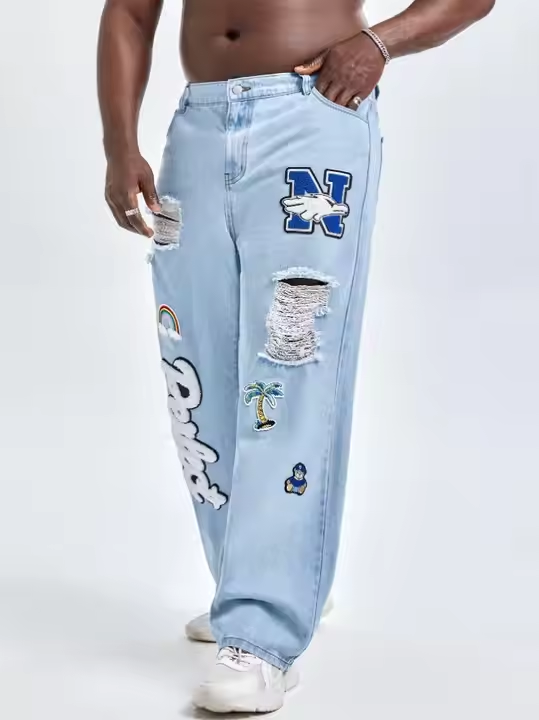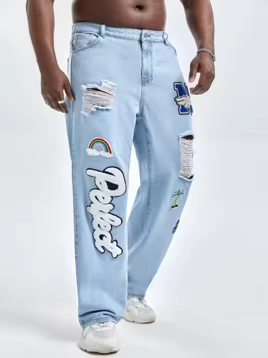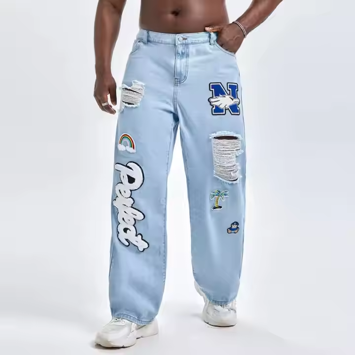 กางเกงยีนส์ขาตรงสำหรับผู้ชายกางเกงยีนส์แฟชั่นโอเวอร์ไซส์ผ้าคอตตอนพิมพ์ลายกราฟิกแบบขาดสำหรับ100% โลโก้ออกแบบได้ตามต้องการ