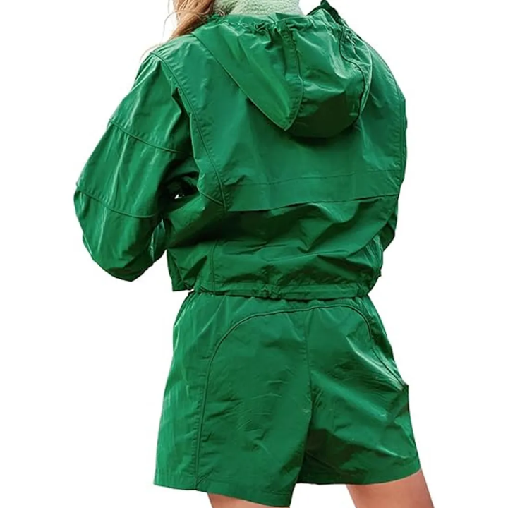 ชุดออกกำลังกายโยคะแบบมีฮู้ดพร้อมโลโก้สั่งทำพิเศษสำหรับผู้หญิง ชุดเซ็ต 2 ชิ้น เสื้อแจ็คเก็ตและกางเกงขาสั้นเข้าชุดลำลอง