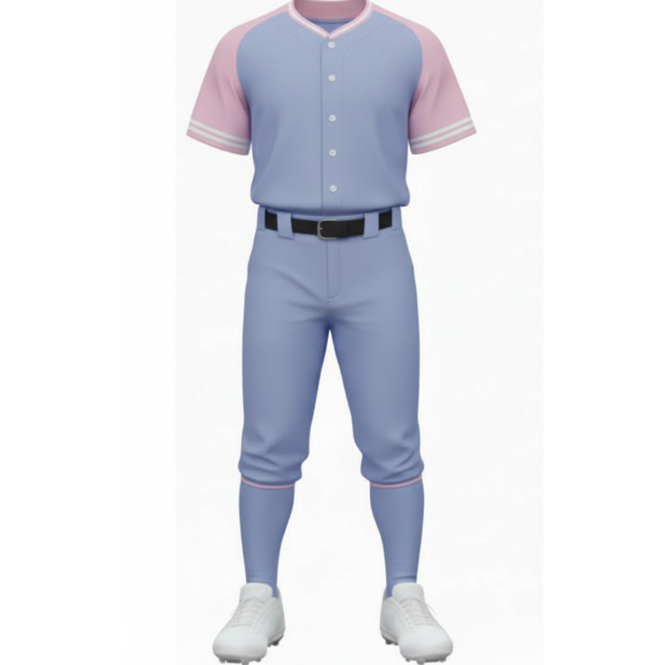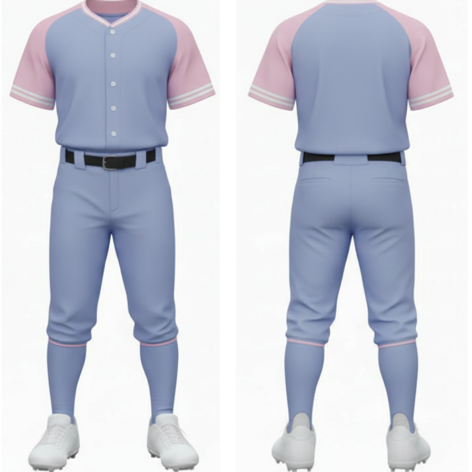 ชุดเบสบอลแขนยาวสีฟ้าอ่อนและชมพูแบบเรียบง่ายพร้อมกางเกงกีฬา สามารถใส่โลโก้ได้