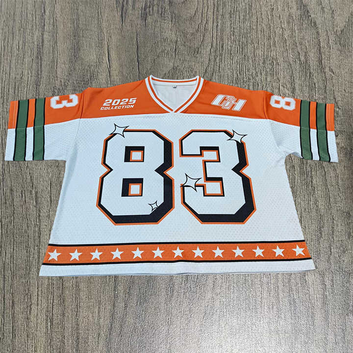 เสื้ออเมริกันฟุตบอลน้ำหนักเบาพิมพ์โลโก้ตามสั่ง เสื้อฟุตบอลตาข่ายสีตามสั่ง ดีไซน์ล่าสุด เสื้อกีฬาสำหรับผู้ชาย