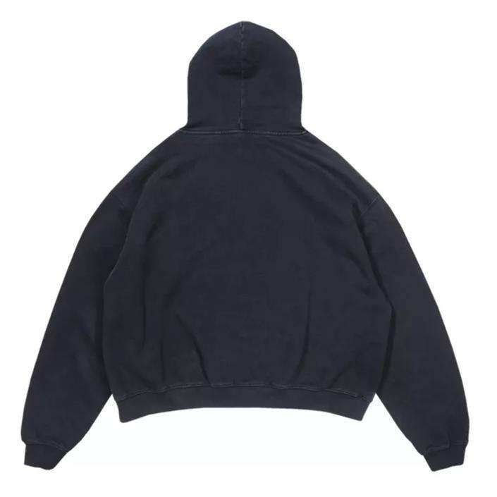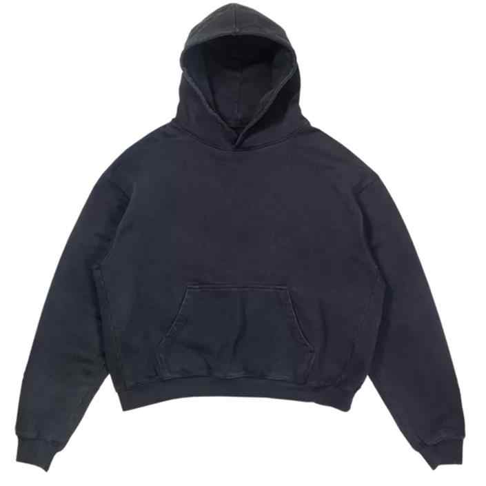 เสื้อฮู้ดดี้ผู้ชายทรงโอเวอร์ไซส์ ผ้าหนา 100% ผ้าฝ้าย ยูนิเซ็กซ์ สีดำล้วน ล้างสีแบบวินเทจ ขอบดิบ ตัดสั้น สกรีนโลโก้ได้