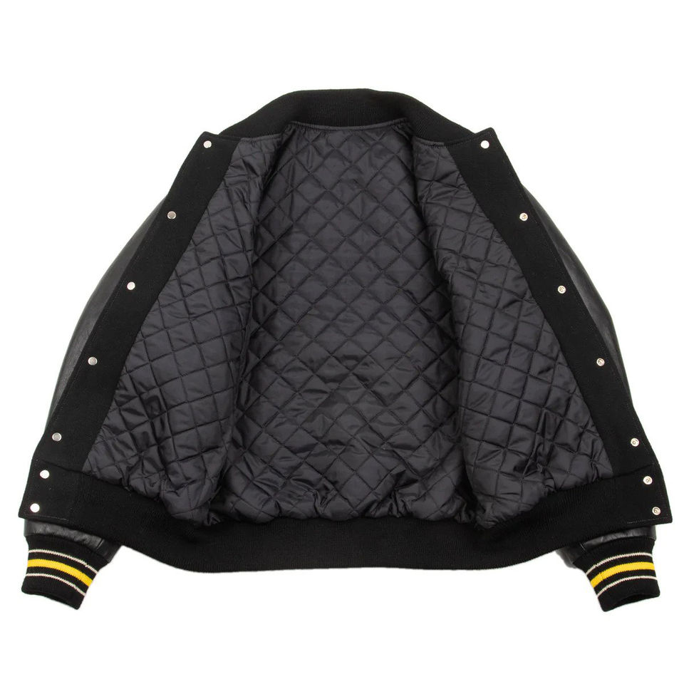 แจ็คเก็ตบอมเบอร์ลายตัวอักษรสีดำสำหรับผู้ชายผู้หญิงเสื้อแจ็คเก็ตหนังสีดำเข้มโลโก้ออกแบบได้ตามต้องการ