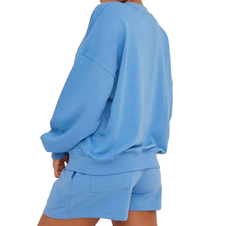 ชุดเสื้อวอร์มคอกลมและกางเกงขาสั้นสำหรับผู้หญิงชุด2ชิ้นเสื้อวอร์มคอกลมสีพื้นโลโก้ตามสั่งแฟชั่นใหม่ฤดูร้อน