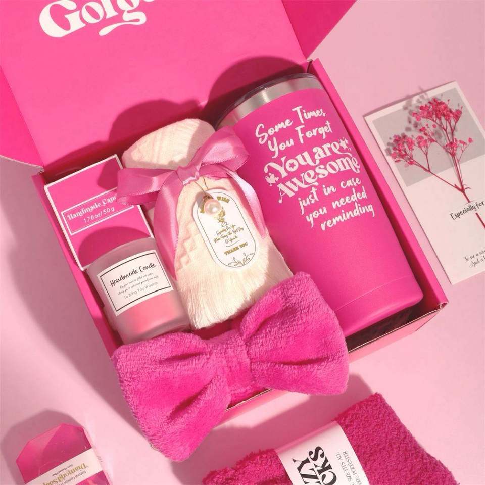 ชุดของขวัญสำหรับปีใหม่และคริสต์มาส ประกอบด้วยแปรงทำความสะอาดแก้วน้ำในรถยนต์ ผ้าปิดตา และชุดอาบน้ำ สีชมพูแดง พร้อมโลโก้สั่งทำพิเศษ เหมาะสำหรับเป็นของขวัญ