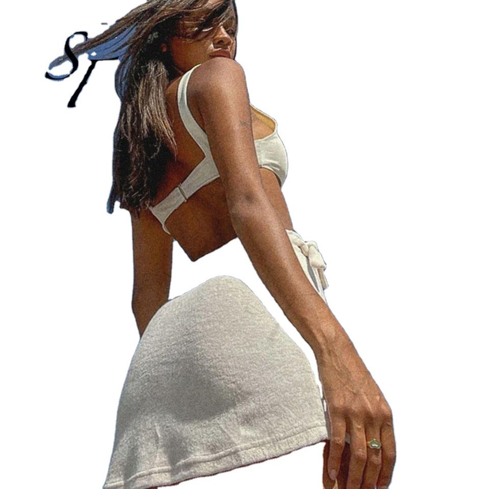 ชุดเซ็ตกระโปรง 2 ชิ้น สไตล์ลำลองสำหรับผู้หญิง ผ้าเทอร์รี่คอตตอนลายโลโก้แบบเรโทร เหมาะสำหรับใส่ไปเที่ยวทะเลช่วงฤดูร้อน ทรงเอไลน์ผูกเอว ดีไซน์เซ็กซี่