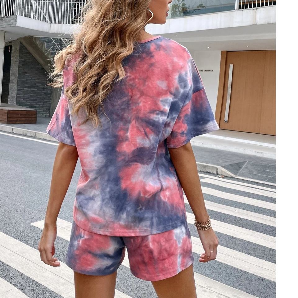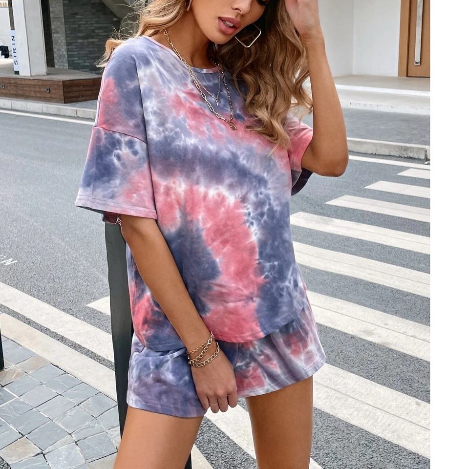 ชุดเซ็ต 2 ชิ้น ลายมัดย้อม พร้อมโลโก้สั่งทำ ชุดเซ็ต 2 ชิ้นสำหรับผู้หญิง ชุดเซ็ตเสื้อผ้าผู้หญิง กางเกงขาสั้น ชุดฤดูใบไม้ผลิ ฤดูร้อน OEM เสื้อผ้าฤดูร้อน ชุดสูทขาสั้น
