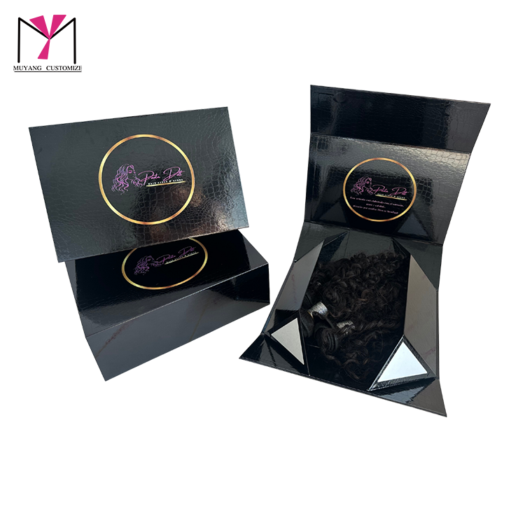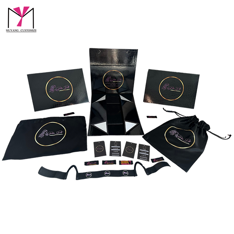 กล่องกระดาษแข็งพิมพ์ลายโลโก้แบบกำหนดเอง พร้อมถุงผ้าซาติน แถบกาว และการ์ดติดผม