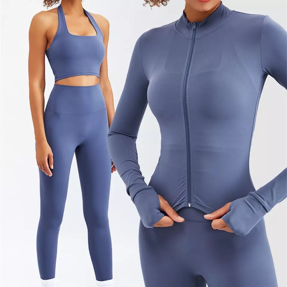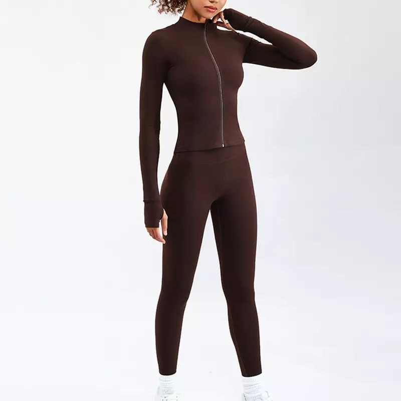 ชุดออกกำลังกายผู้หญิงแบบสองชิ้น ชุดซิปแขนยาว เสื้อซิปและเลกกิ้งเอวสูง ชุดกีฬาแขนยาว พร้อมโลโก้สั่งทำ