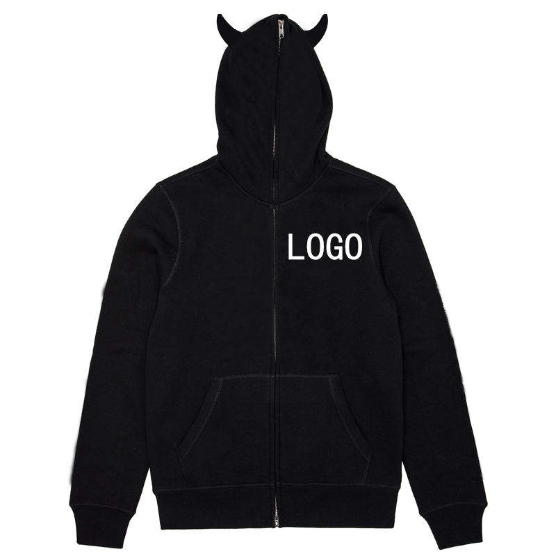 เสื้อฮู้ดดี้ผู้ชายแบบซิป ปักโลโก้ตามสั่ง ลายเขาปีศาจขนาดใหญ่ ผ้าคอตตอนหนานุ่มคุณภาพสูง 360 กรัม