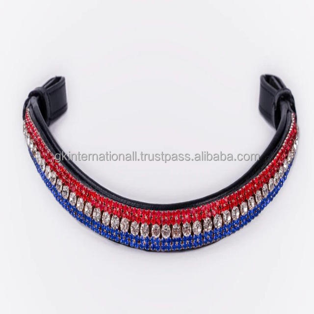 ที่กำหนดเองทำ5แถวสีแดงสีขาวและสีฟ้าคริสตัลไรน์สโตนทั้งหมดรูปร่างหนังเบาะหนังม้าสายรัดเต็ม