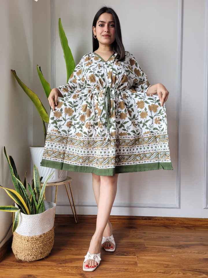 ชุดเดรสมิดิผ้าฝ้ายย้อมสีมือคอวีและเอวแบบผูกเชือกสำหรับผู้หญิงเหมาะสำหรับลูกค้าร้านบูติกและตัวแทนจำหน่ายตามสั่ง