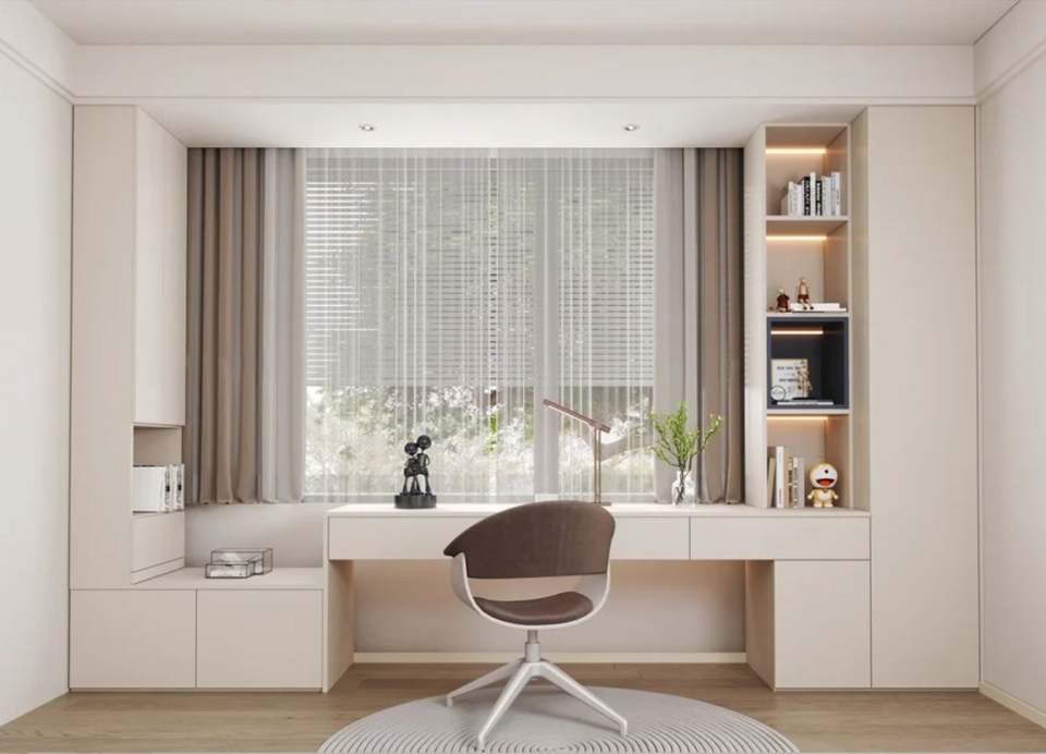 ตู้หนังสือไม้แบบโมเดิร์นเรียบง่ายสั่งทำพิเศษ พร้อมโต๊ะทำงานในตัว เป็นมิตรกับสิ่งแวดล้อม ประหยัดพื้นที่ สำหรับบ้าน สำนักงาน ห้องนอน โรงเรียน