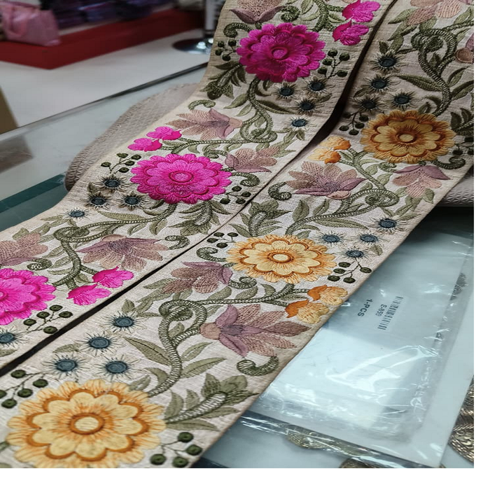 ผ้าลูกไม้ปักลายดอกไม้สั่งทำตามแบบบนผ้าฐานสีเบจพร้อมด้ายลายดอกไม้หลากสีออกแบบให้มีความกว้าง3นิ้ว