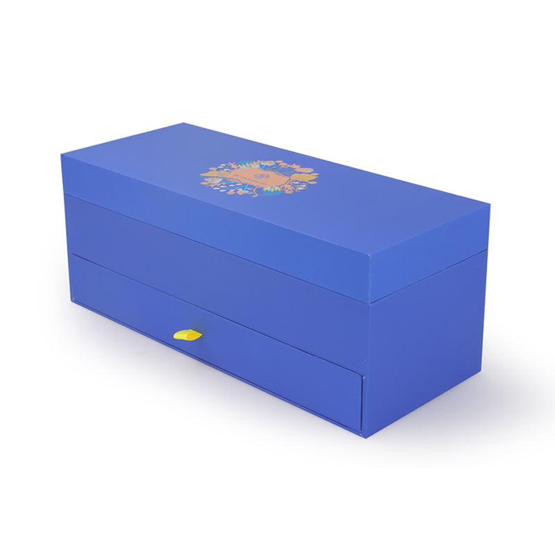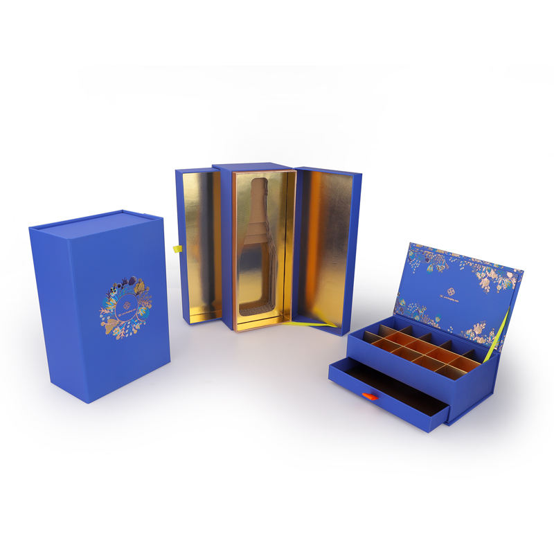 ที่กำหนดเองทำหรูหราแมตต์สีดำกระดาษแข็งแข็งกล่องบรรจุภัณฑ์สุราแชมเปญวิสกี้ขวดไวน์สีฟ้ากล่องของขวัญกระดาษแก้ว