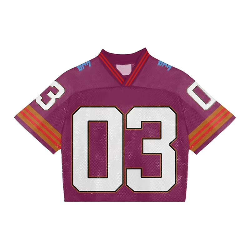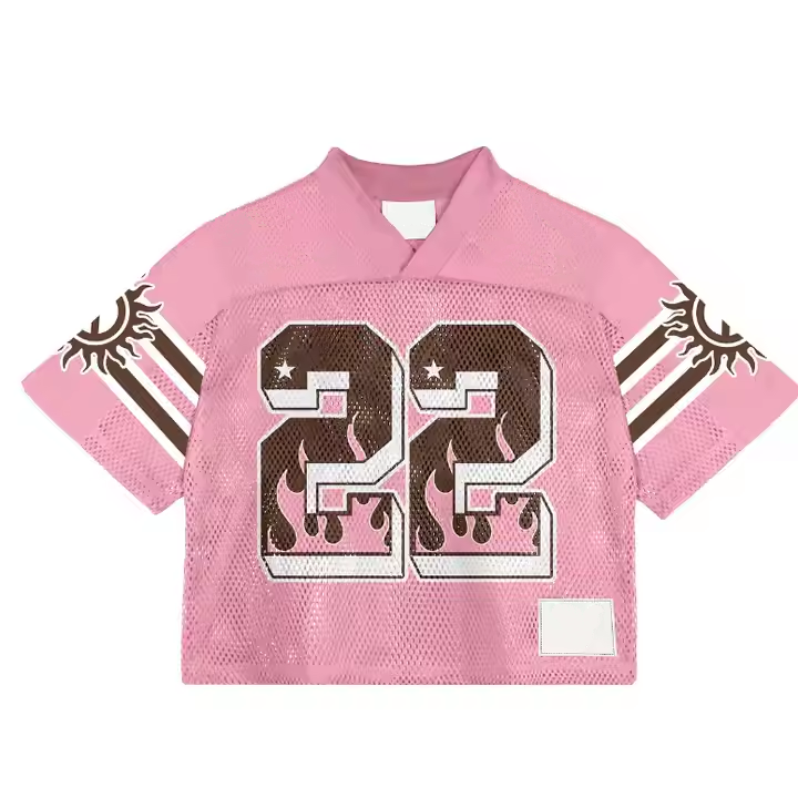 ผู้ผลิตเสื้อฟุตบอลอเมริกันแบบกำหนดเอง เสื้อยืดฟุตบอลผู้ชายสไตล์สตรีทแวร์ ทรงหลวม ผ้าตาข่าย แขนสั้น เสื้อครอปสำหรับฤดูร้อน