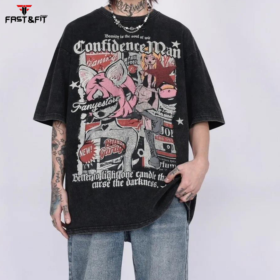 เสื้อยืดผู้ชายสั่งทำคุณภาพสูงคอตตอน100% คอกลมพิมพ์ลายอนิเมะไหล่ปล่อยเสื้อโอเวอร์ไซส์ลายตัวอักษร
