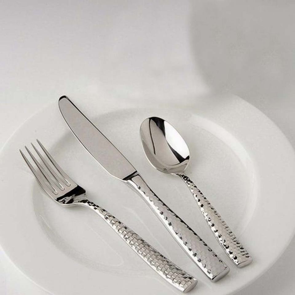 ชุดมีดขัดเงากระจกนิกเกิลสำหรับการตั้งแคมป์ช้อนส้อมช้อนมีดสเตนเลสด้ามค้อนสีเงินแบบเต็มรูปแบบออกแบบได้ตามต้องการ