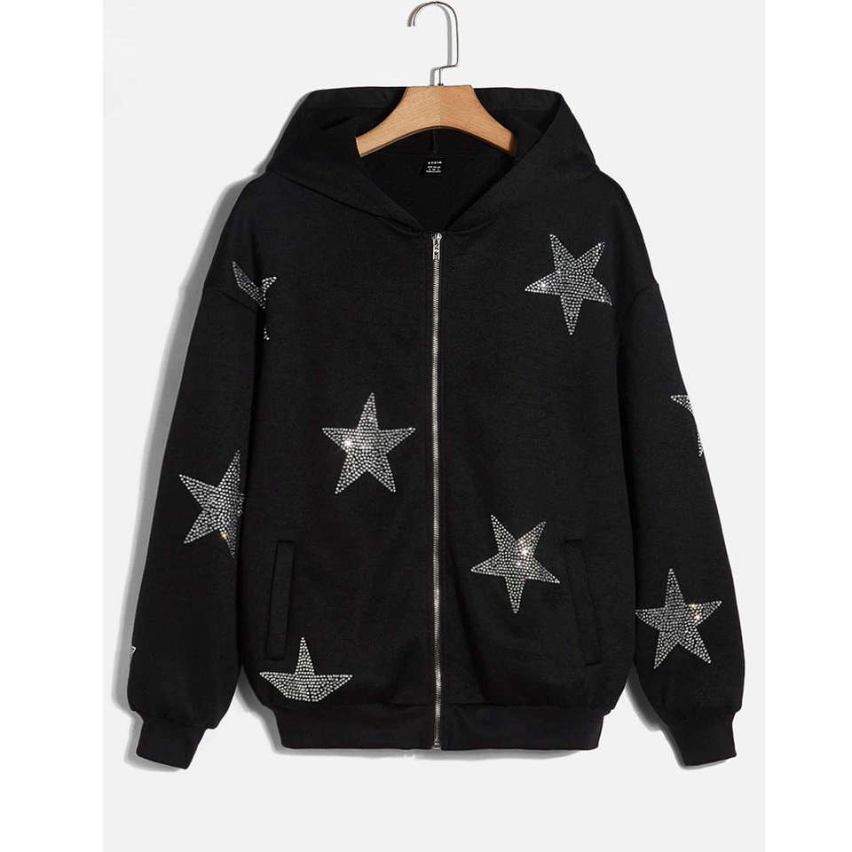 เสื้อมีฮู้ดผ้าซาตินมีซิปเต็มตัวสำหรับทุกเพศทำจากผ้าเฟรนช์เทอร์รี่ประดับพลอยเทียมพิมพ์ลาย