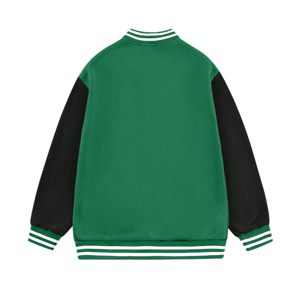 เสื้อแจ็คเก็ตวาร์ซิตี้สีเขียว แขนสีดำ แบบยูนิเซ็กซ์ คอปก แขนเสื้อ และชายเสื้อแบบมีแถบยางยืด ติดกระดุมแป๊ก เสื้อโค้ทลำลอง