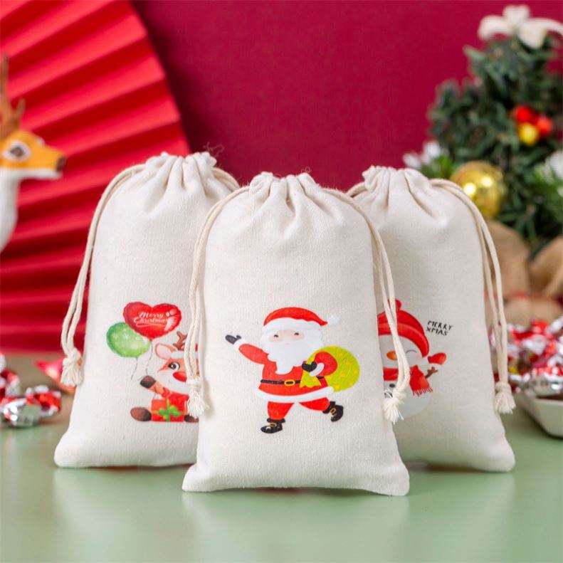 ถุงผ้าฝ้ายรีไซเคิลขนาด 10*15 ซม. ปรับแต่งได้ พร้อมเชือกผูก สำหรับใส่ขนม ของขวัญ ของชำร่วย ลายพิมพ์โลโก้ ธีมคริสต์มาส ป้องกันฝุ่น เหมาะสำหรับใส่เครื่องประดับ ขนม ของขวัญ