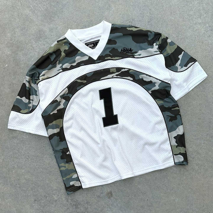 เสื้อยืดตาข่ายผ้าโพลีเอสเตอร์คอวีปักลายสำหรับผู้ชายเสื้อลายพรางแขนสั้นแบบวินเทจแห้งเร็วปรับแต่ง100%