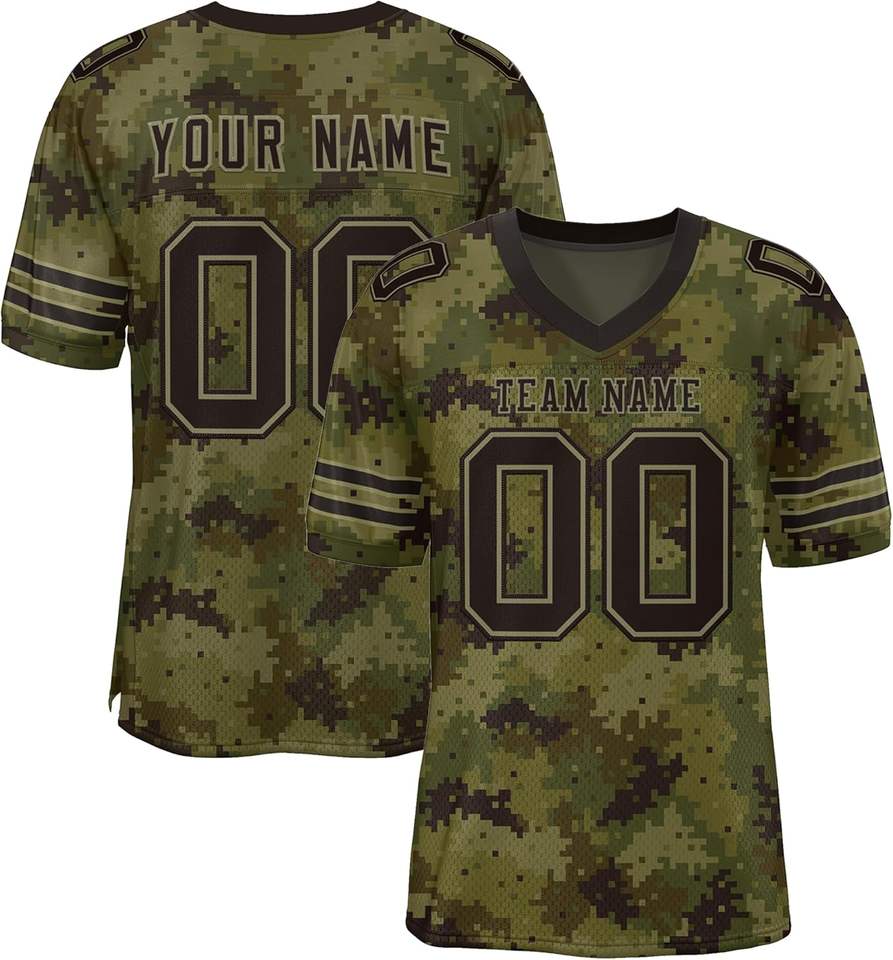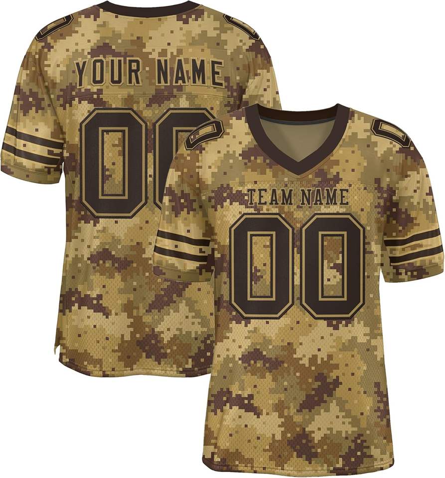 เสื้อฟุตบอลอเมริกันแบบปรับแต่งได้ ระบายอากาศได้ดี ลายพราง ดีไซน์แนวทหาร ทนทาน ผลิตจากโพลีเอสเตอร์ 100% มีตัวเลือกไซส์ใหญ่พิเศษ