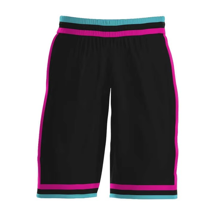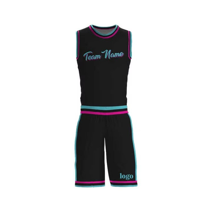 ชุดยูนิฟอร์มบาสเก็ตบอลแบบปรับแต่งได้ สีดำ ชมพูนีออน และเขียวอมฟ้า เสื้อคอกลมและกางเกงขาสั้น ชุดทีม