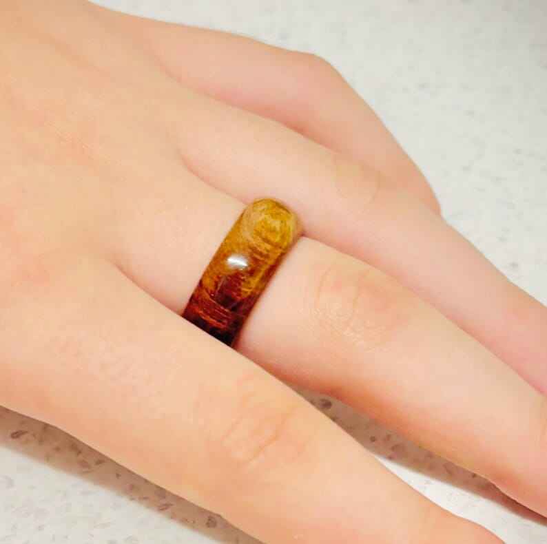 แหวนแต่งงานไม้โค้งแบบปรับแต่งได้ ผิวขัดเงา ดีไซน์น้ำหนักเบา สลักชื่อฟรี วัสดุไม้ทำมือ