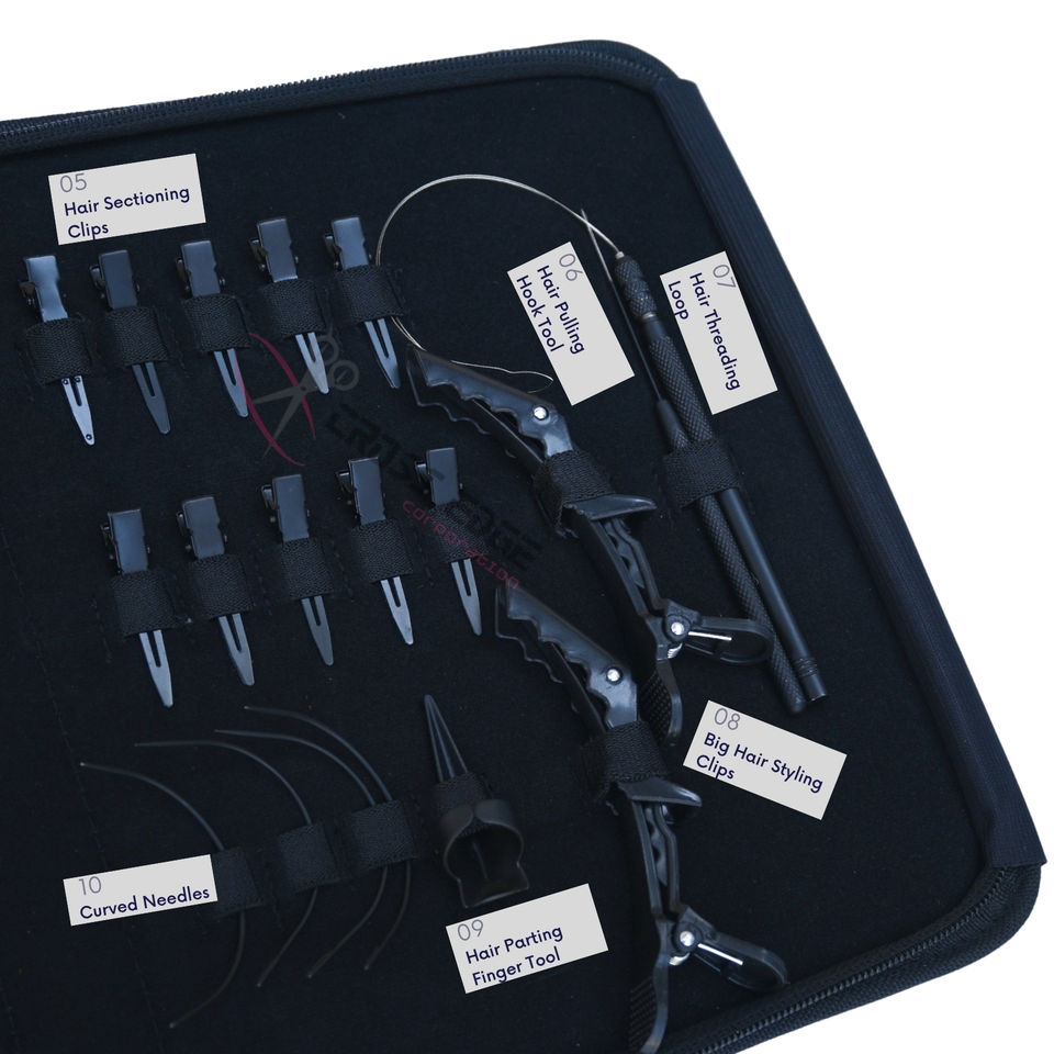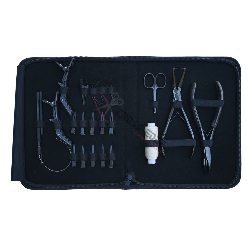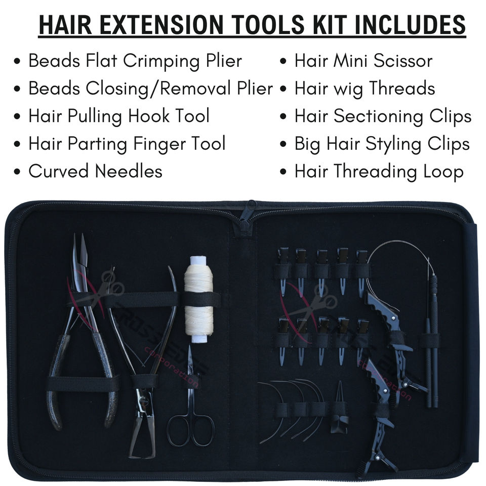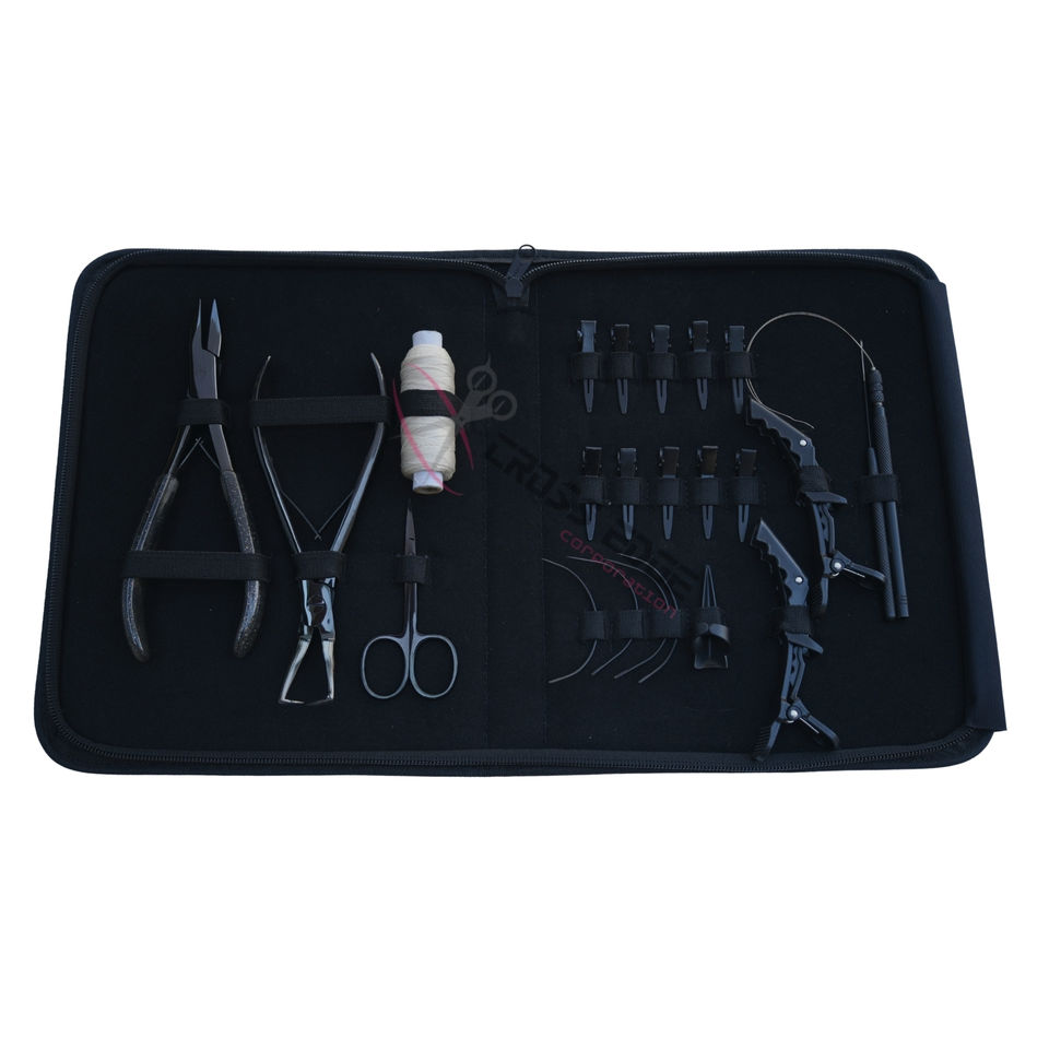 ชุดอุปกรณ์ต่อผมสีดำแบบปรับแต่งได้ ประกอบด้วย ลูกปัดแบน คีมจีบผม คีมต่อผม ตะขอเกี่ยวผม และนิ้วสำหรับแยกผม