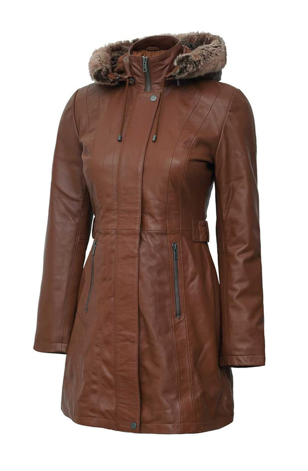 Customizable Brown Slim Fit Women's Jacket Factory Price Original Leather Coat with Removable Fur Trim Hood Canvas Fabric