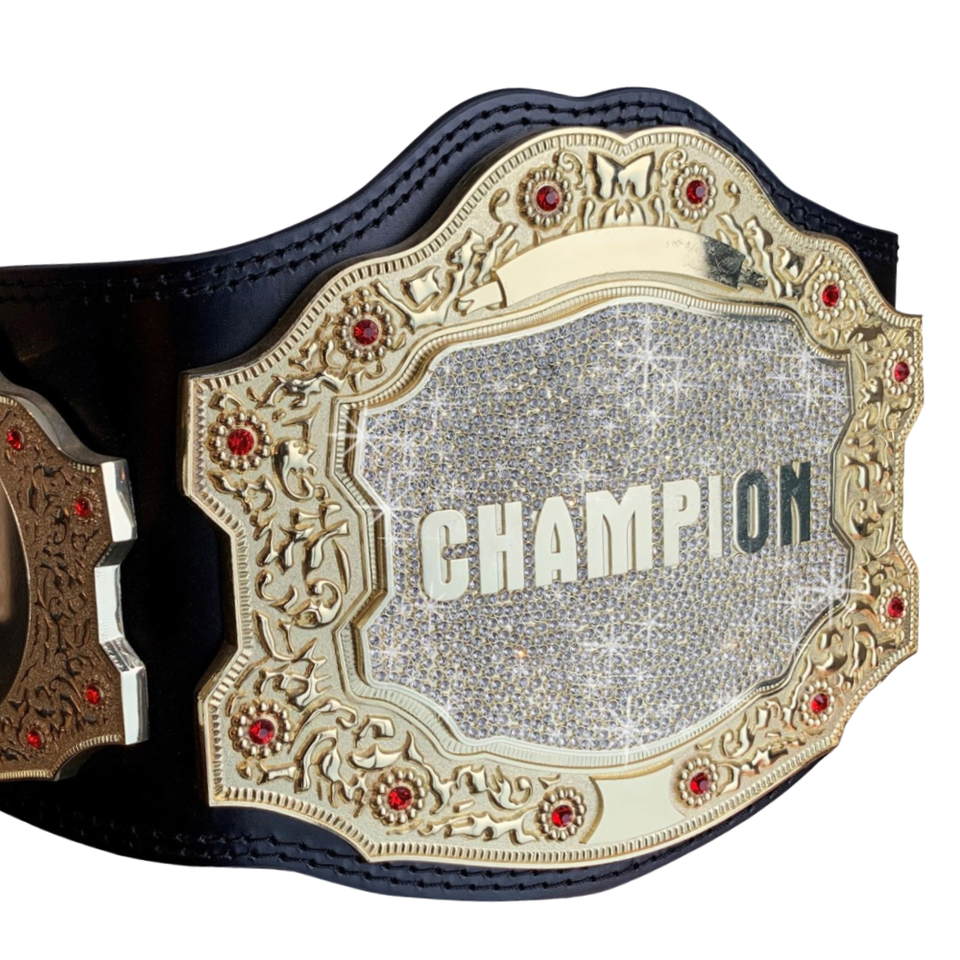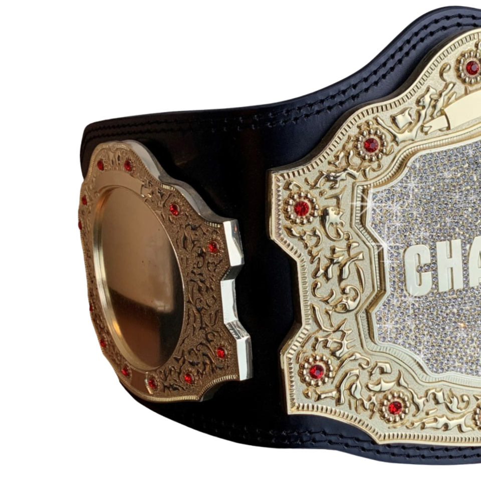 เข็มขัดแชมป์แบบปรับแต่งได้ พร้อมตกแต่งด้วยทองคำและจุดประกายตรงกลาง คุณภาพพรีเมียม ทำจากหนังสีดำ