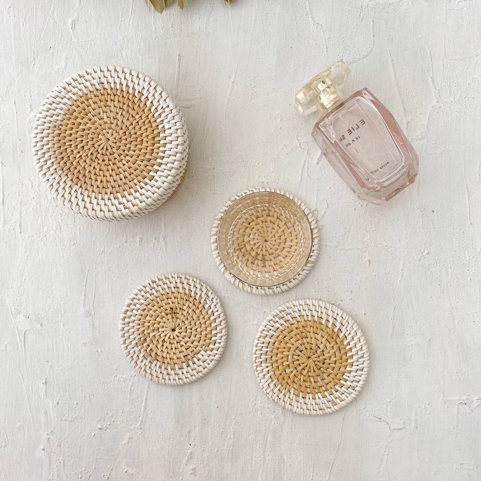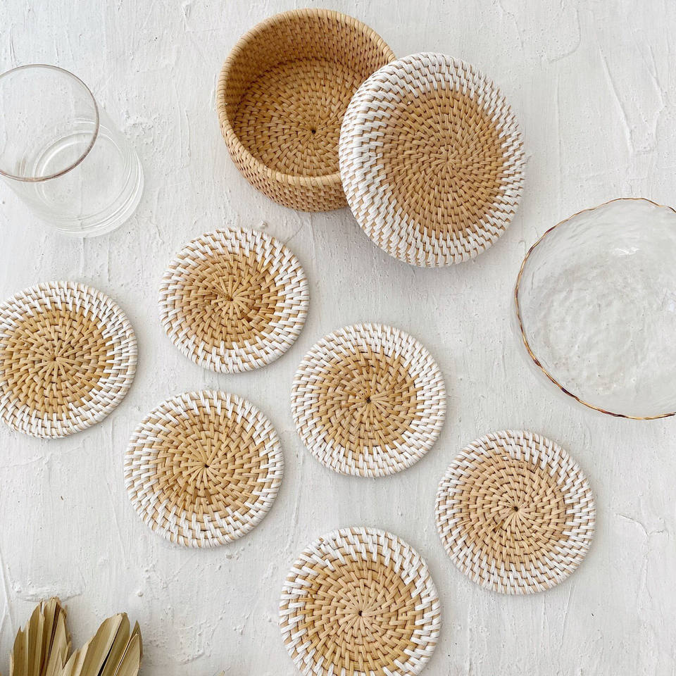 ชุดที่รองแก้วปรับแต่งได้พร้อมที่รองแก้วหวายสีขาวสำหรับร้านอาหารกาแฟหรือโต๊ะแต่งงาน