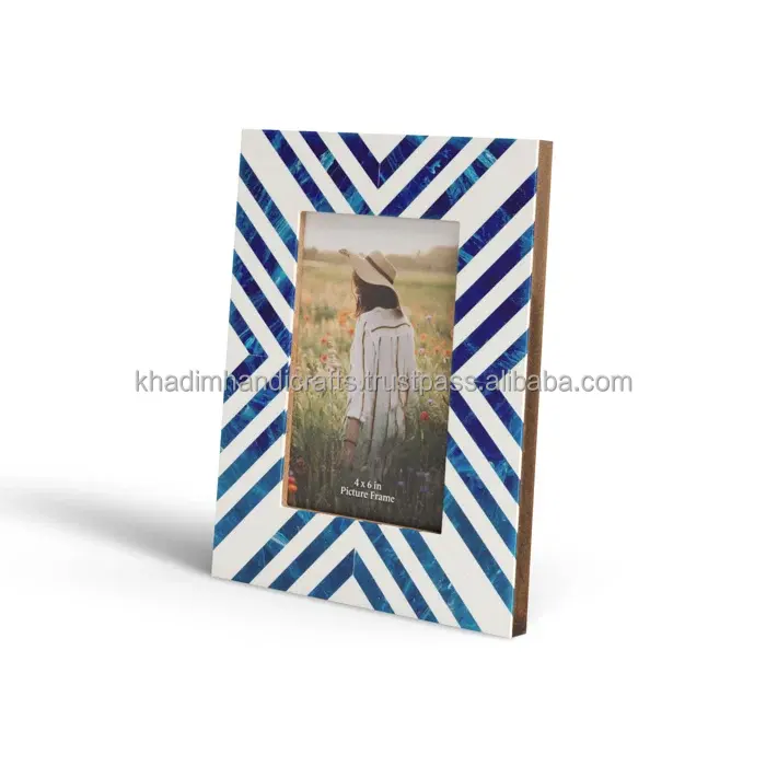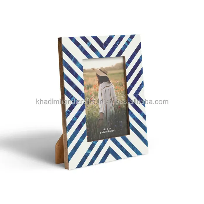 Customizable DIY Photo Frame Modern Solid Blue Wood with Resin Inlaid Chevron Design, Iron Metal Shape, Engraved Logo Option