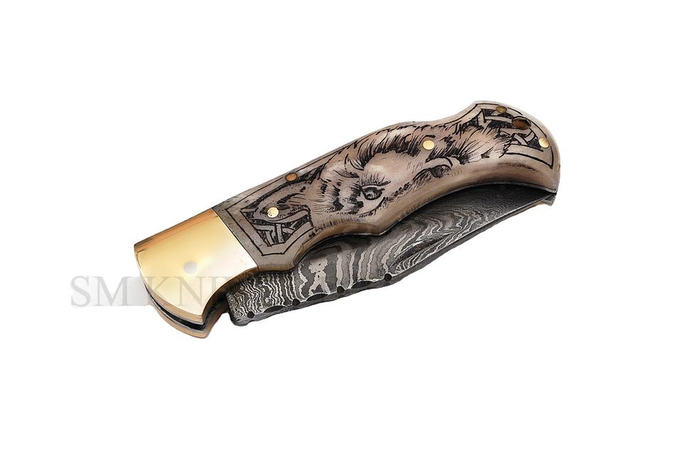 Customizable Industrial Grade Damascus Steel Slide Open Pocket Knife for Outdoor Camping Hiking Survival Leather Sheath-OEM