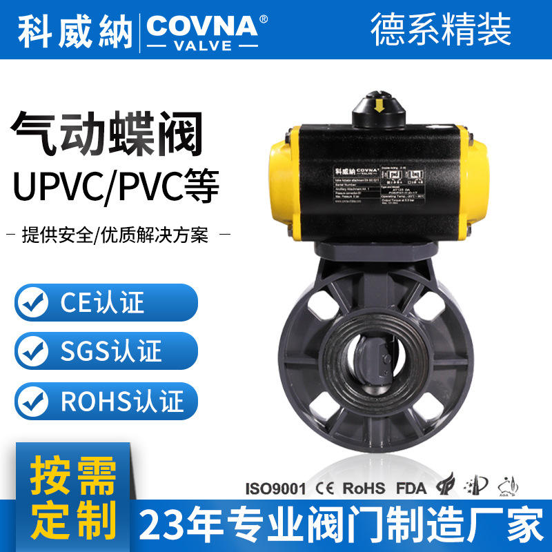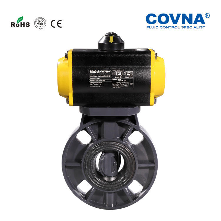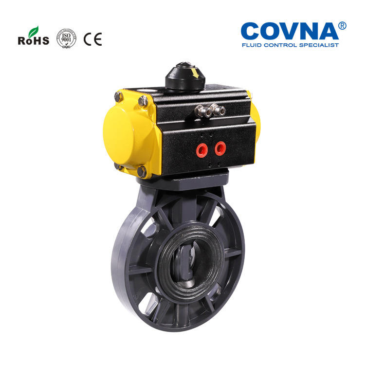 วาล์วผีเสื้อแบบนิวเมติกชนิดเวเฟอร์ UPVC แบบปรับแต่งได้ ทำงานสองทาง ปิดเร็ว สำหรับน้ำมัน ทนกรด ด่าง ซีลนุ่ม ควบคุมด้วยไฟฟ้า