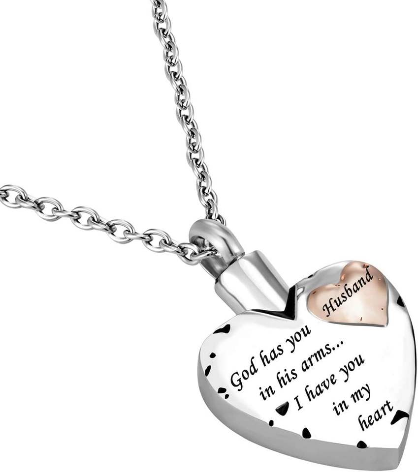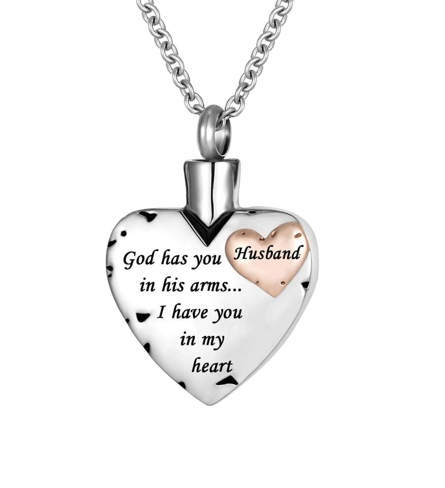 สร้อยคอใส่เถ้ากระดูกรูปหัวใจสองชั้นแบบปรับแต่งได้โกศทรงมีแขนของเขาพร้อมจี้ที่ระลึกถึงสามี