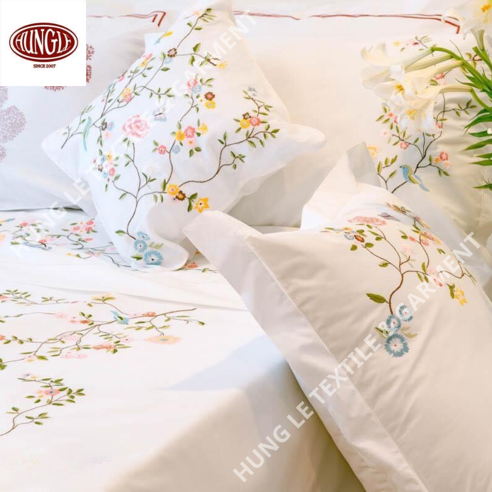 ผ้าปูเตียงและปลอกหมอนผ้า100% ปักลายดอกไม้ปรับแต่งได้สำหรับโอกาสแสดงความยินดี