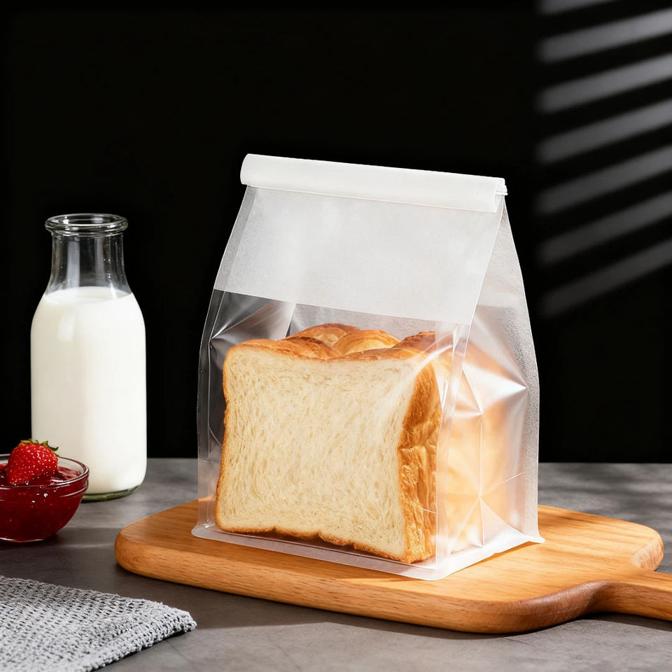 ถุงขนมปังแบบตั้งได้ ผลิตจากกระดาษคราฟท์ ปิดผนึกได้ ป้องกันความชื้น เป็นมิตรกับสิ่งแวดล้อม ใช้สำหรับใส่ขนมหวานและขนมอบ พร้อมหูหิ้วแบบริบบิ้น ปรับแต่งได้ตามต้องการ